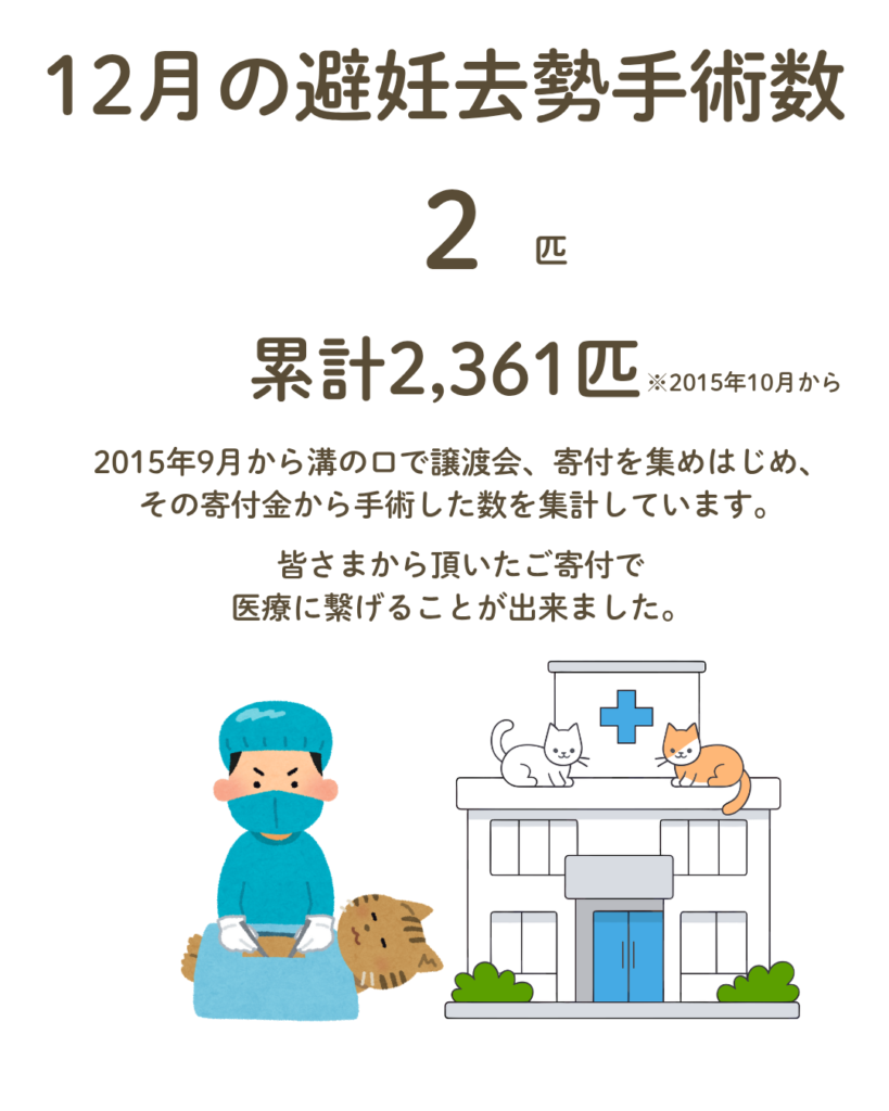今月のTNRオペ数は2頭(報告が上がってい数)累計2361頭ですが、