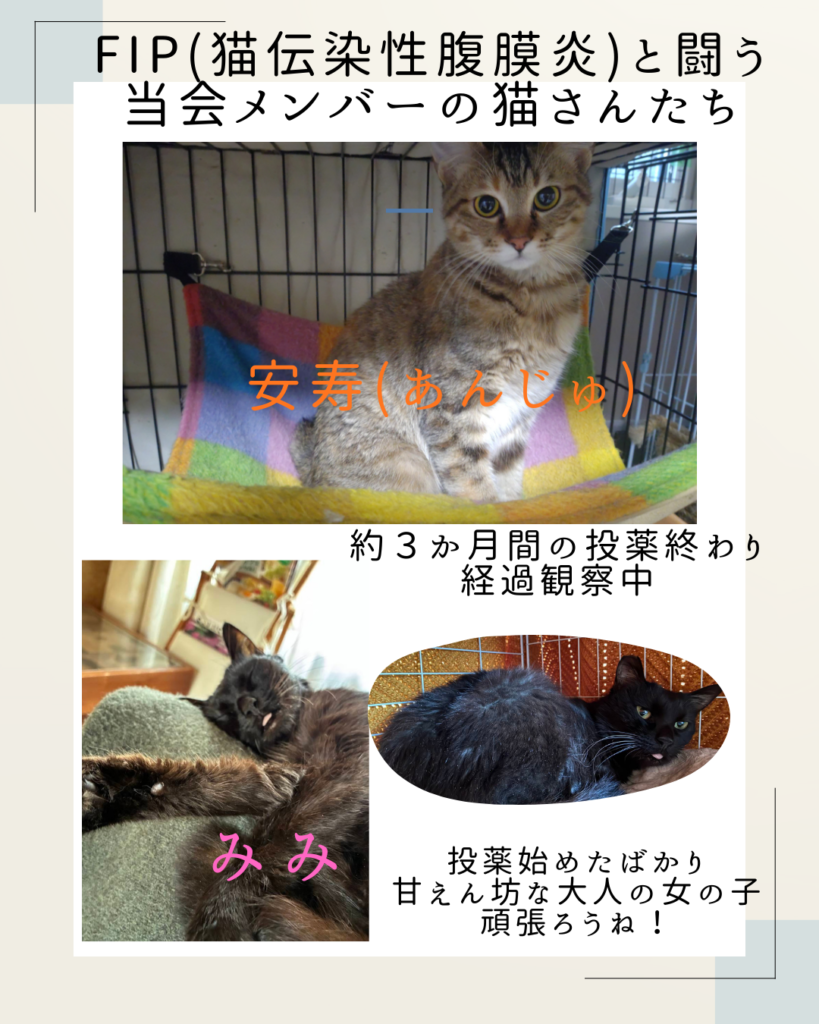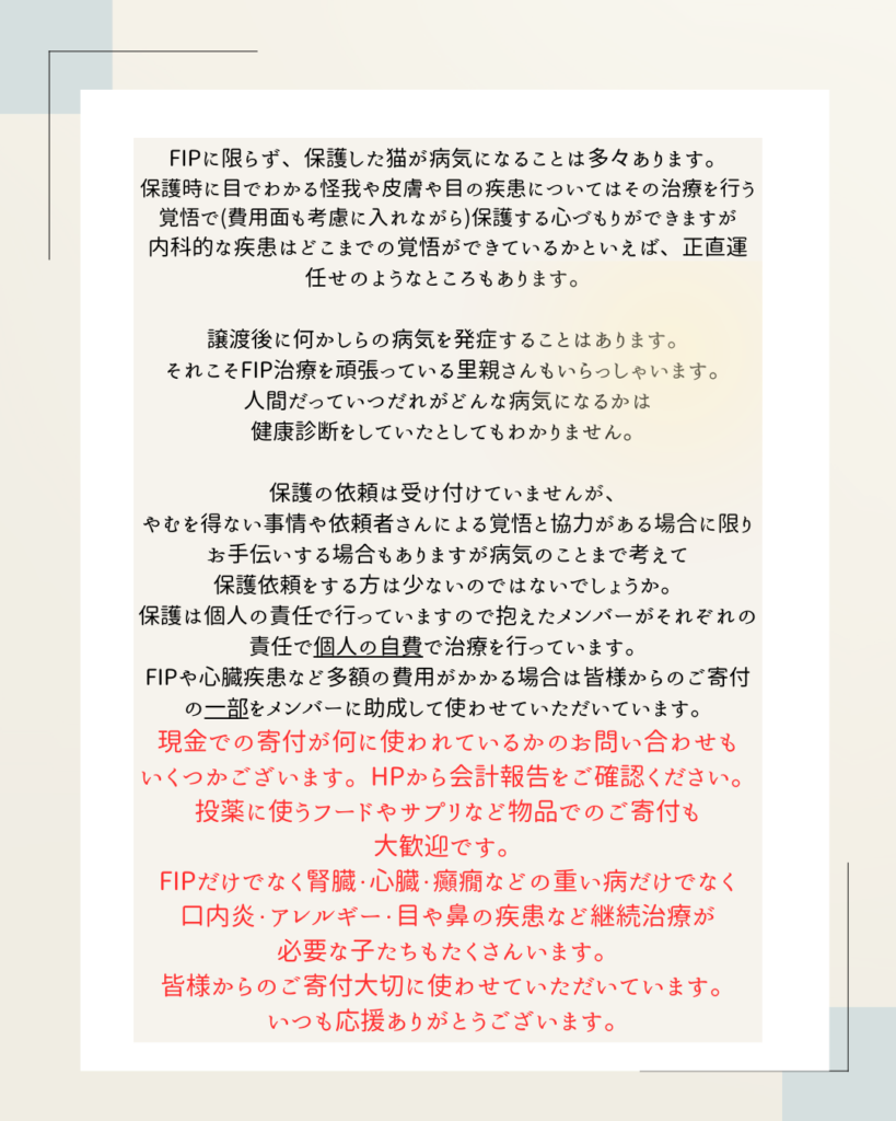 私は個人的に里親さんにはペット保険に入ることを強くお勧めしています。FIPに対応している保険もいくつか出ています。