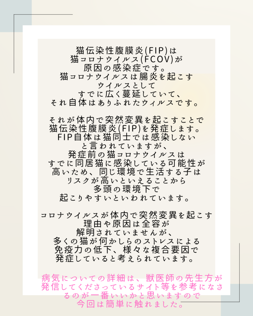 FIPという病気を聞いたことがあると思います。ひと昔前よりは治療の選択肢も広がり、寛解する確率も高くなってきましたが、まだまだどの病院でも気軽に安価に治療できる病気ではありません。